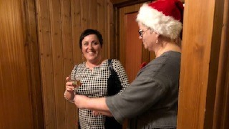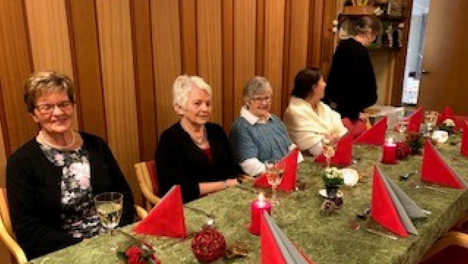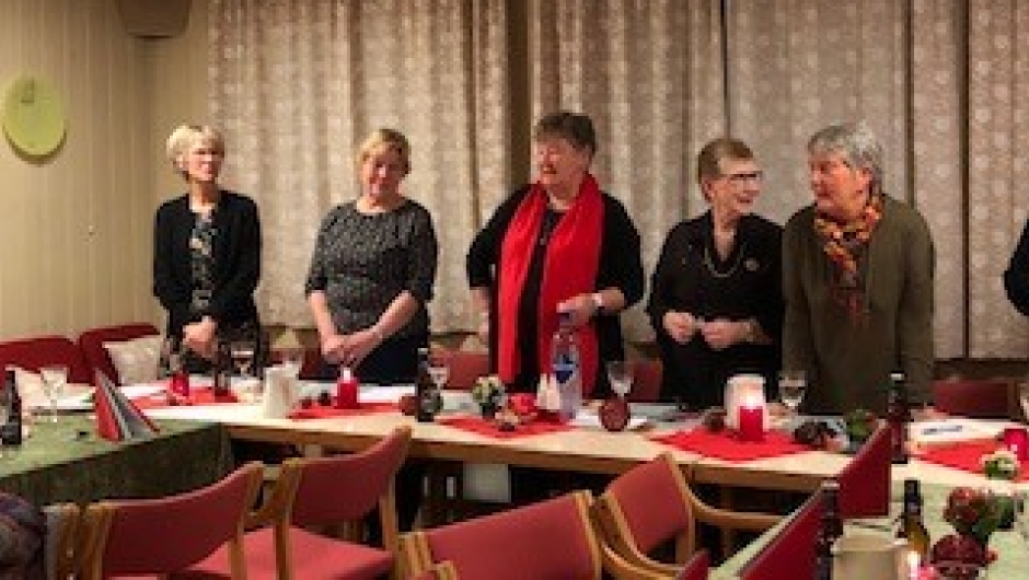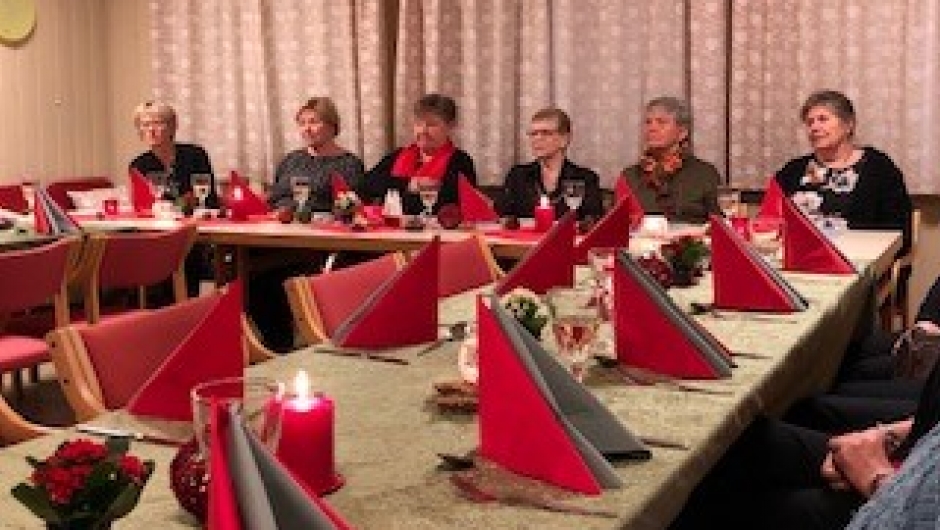 Leder Torild Sønsthagen ønsket velkommen og kvelden ble innledet med julesangene jingle bells og det lyser i stille grender med vår dyktige sanger Hildegard Søli Berge som forsanger. Lukten av god julemat spredde seg på Fredheim og det var god stemning med mye prat og latter. Leder hadde en overraskelse til de fremmøtte. Det var limt lapper under tilfeldige stoler og den heldige kunne ta med seg en blomst hjem. Kveldens store overraskelse på lappen var gratis konsert med Black and Lekker 12.12. Hildegard oppfordret oss andre som gikk glipp av gratisbilletten til å løpe å kjøpe billett, for dette er en konsert som er verdt å få med seg.