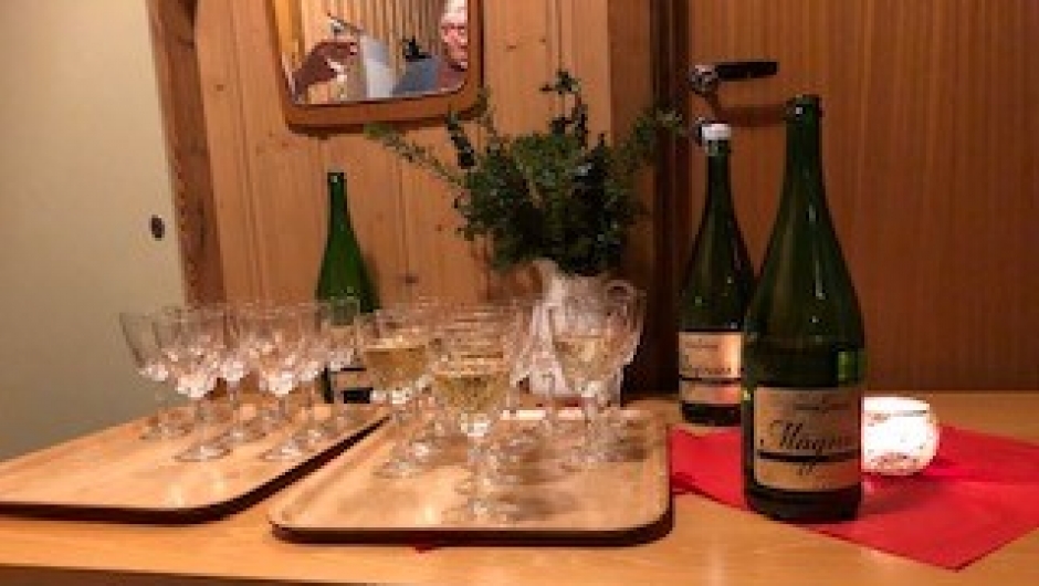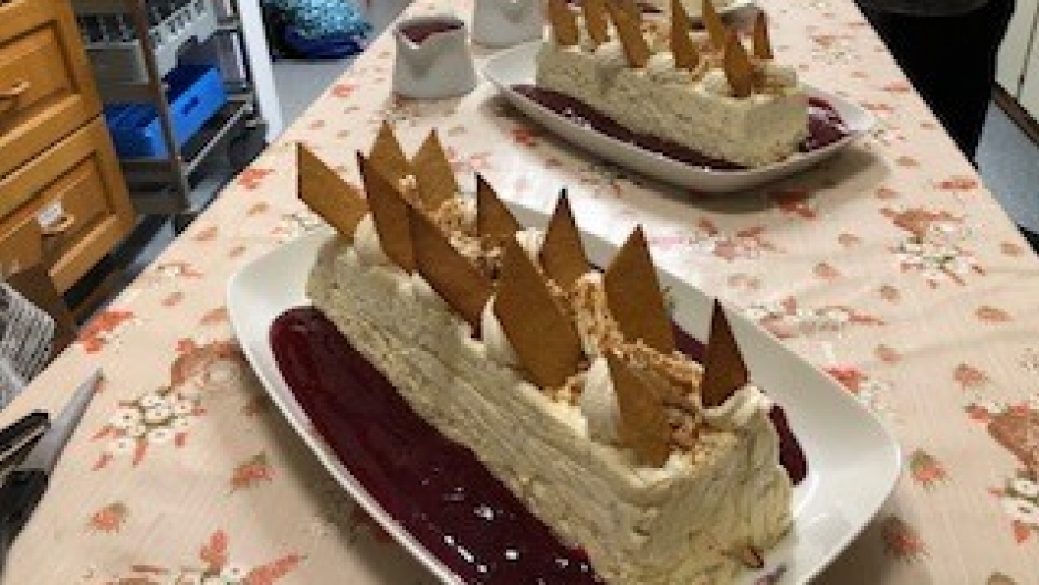Det ble sunget nå har vi vaska gulvet og dreaming about a white christmas før desserten ble servert. Desserten var kveldens andre overraskelse og helt i bygdekvinnenes ånd. Det var store flotte byggrynsfromasjer med rød stikkelsbærsaus laget av kokken Hildegard. Fromasjene var pyntet med pepperkaker og mandler.