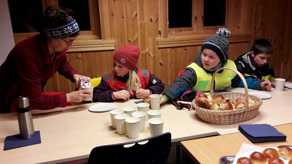 På fastelavnssøndag spanderte me bollar og kakao på Barnas turlag. 15 born og 7 vaksne trassa kald vind og gjekk tur i mørkret med hovudlykter. Samtidig svara dei på spørsmål på utlagde postar. Etterpå var det godt å koma inn i Grindaløo til varm kakao og bollar i ulike variasjonar.