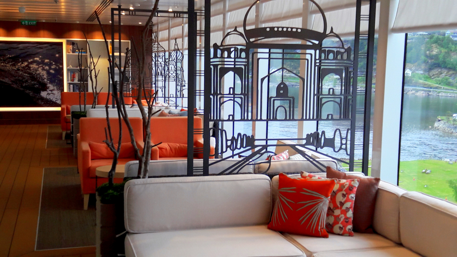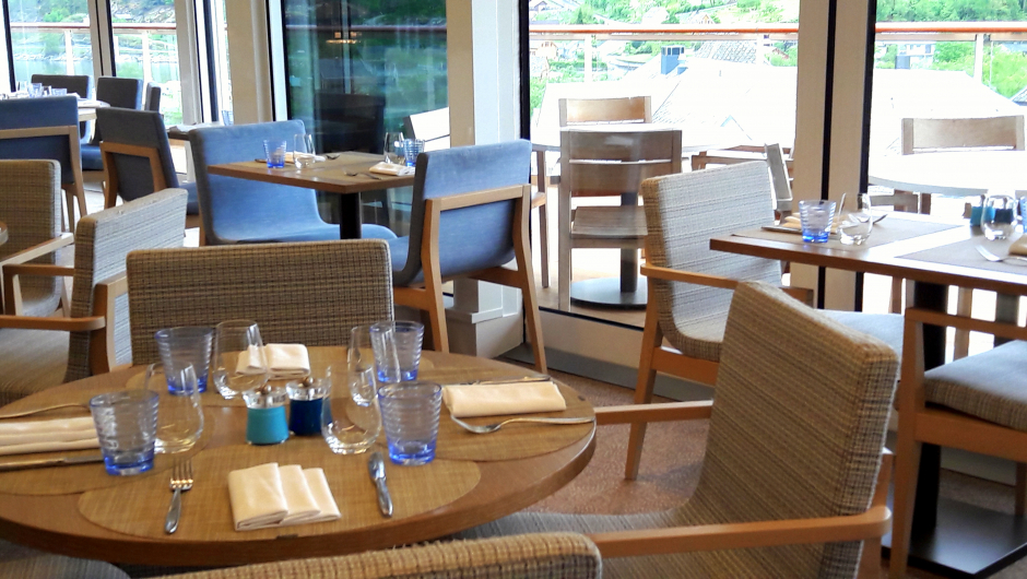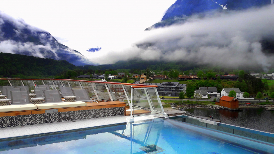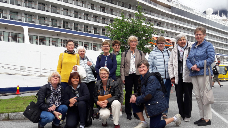 Turnemnda vår hadde i år skaffa oss plass til omvising på cruise-skipet Viking Sea som denne dagen låg til kai i Eidfjord. Eit norskregistrert cruiseskip med plass til 930 passasjerar. Få av oss hadde vore om bord i eit cruiseskip før, kanskje vart dette både første og einaste gongen for mange. Me vart godt mottekne om bord, og etter at me hadde levert frå oss passa våre og gått gjennom sikkerhetskontroll og skanning, var det omvising frå nedste til øvste dekk. Me vart viste rundt i salongar, spa-avdeling, dei mange restaurantane og symjebasseng-områda. Båten hadde og teatersal og eit eige fryserom med snø (!) som gjestene kunne gå inn i. Kanskje direkte frå saunaen og inn dit? Før me forlet båten var det tid til ein kopp kaffi i salongen.