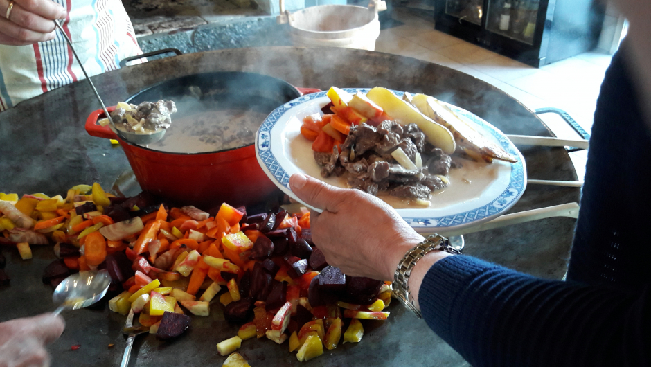 Etterpå var det lunsj hos «Tunet på haugen». Kjekk og triveleg plass, og viltgryta me fekk servert ved peisen var nydeleg. Her var det og ein liten gardsbutikk med lokalmat som brød og syltetøy og div økologisk varer.