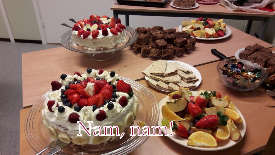 Fleire av innvandrarkvinnene hadde mat med seg, i tillegg hadde vår komité med kaker. Nokre av kvinnene var med å pynta 2 blautkaker, som vart både fine og velsmakande.