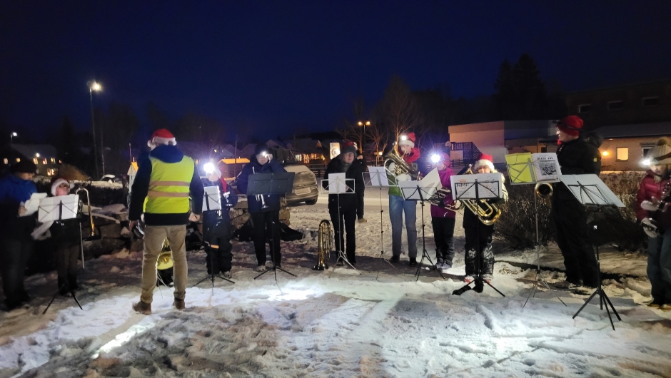 Der spilte Lardal Musikk Korps julesanger og gang rundt juletreet ble det. Et gledelig møte for alle barn ble det også når julenissen kom med nisseposer.