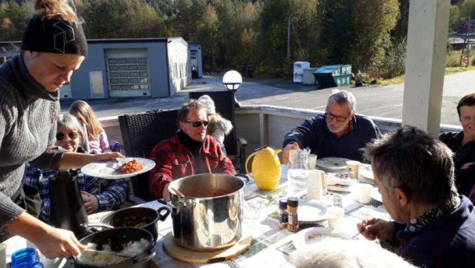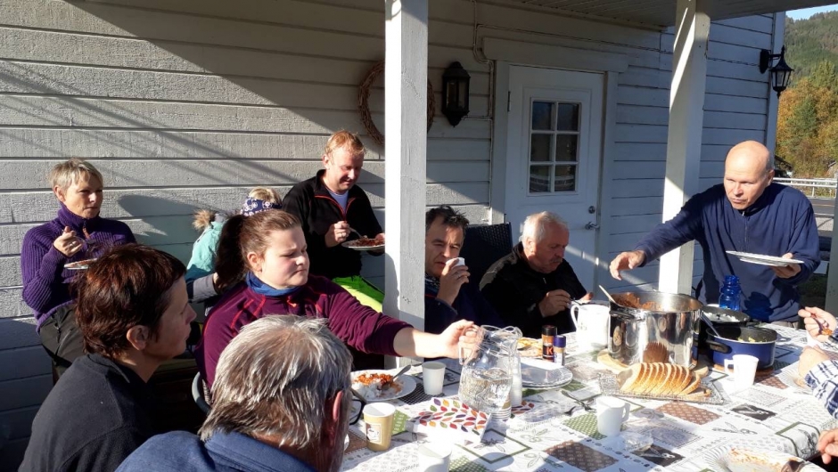 Det ble heldigvis kjempefint vær, og masse folk møtte opp. Bygdekvinnelaget stilte med kaffe og kake, samt en nydelig gryterett. Vi var så heldige at vi fikk komme til verandaen på Gunnvorhuset for å spise.