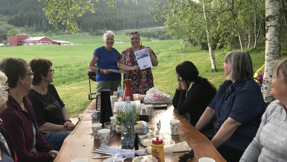Siste kvelden i Kvinner Ut, et prosjekt vi har holdt på med i et års tid. Bygdekvinnelaget ønsker at Kvinner Ut skal føre til sterkere engasjement og aktiviteter for inkludering av minoritetskvinner i Bygde-Norge. Vi har hatt flere samlinger og møter, blant annet to matkurs, strikkekvelder og et soppkurs. Denne kvelden samlet vi oss til grilling på Røttingsneset. Ingunn og Anne Lise hadde ordna med maten slik at vi andre kom til dekket bord. Det var mye god mat på grillen. Både kylling, laks og pølser, og mye godt tilbehør til. Deltakerne (innflytterne) som kunne være med oss denne kvelden fikk utdelt "diplom",- bekreftelse for gjennomføring.