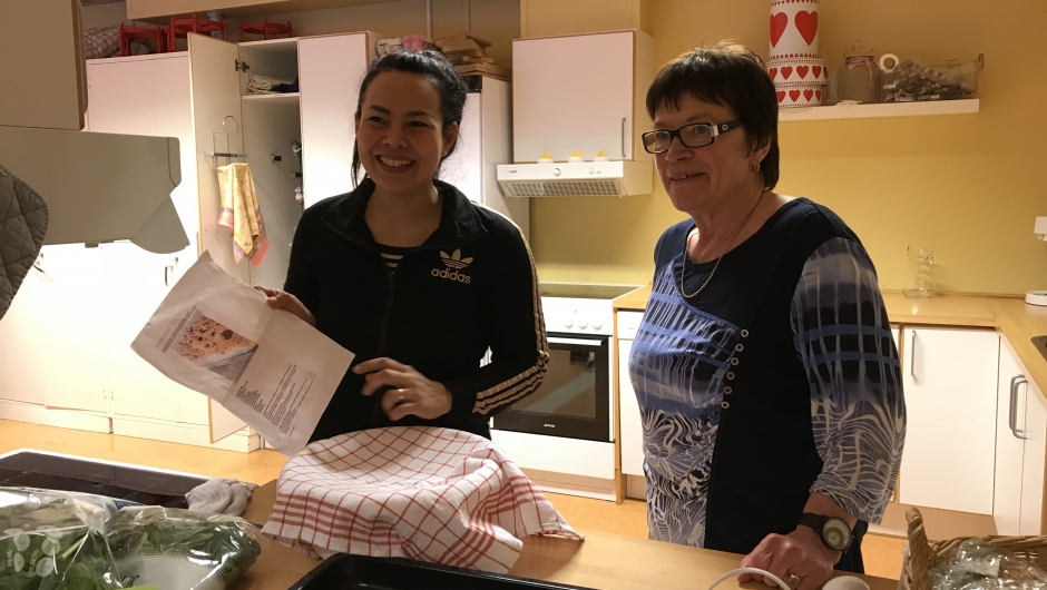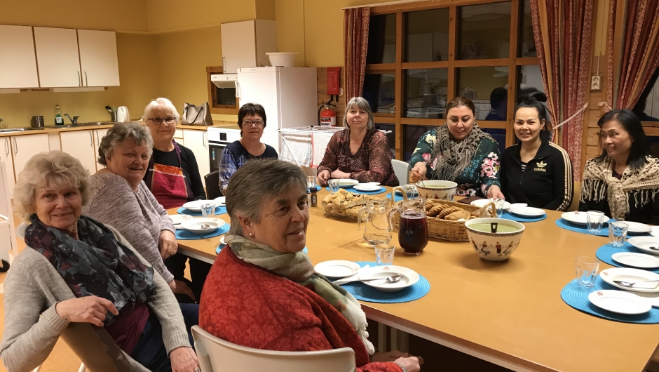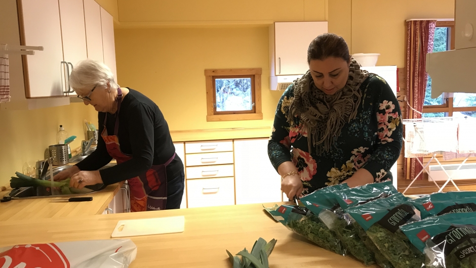 På menyen sto spinat- og grønnkålsuppe som Anne Lise hadde sørget for oppskriften til. Det begynte snart å dufte herlig av hvitløk og andre grønnsaker og krydder på kjøkkenet. Samarbeidet gikk utmerket, og snart sto også foccaciadeigen til heving. Mens vi ventet på maten gikk praten livlig, mest på norsk og littegrann på fingerspråket. Flere flittige damer hadde også tatt med strikketøyet, det kom selvsagt også fram mens vi ventet.