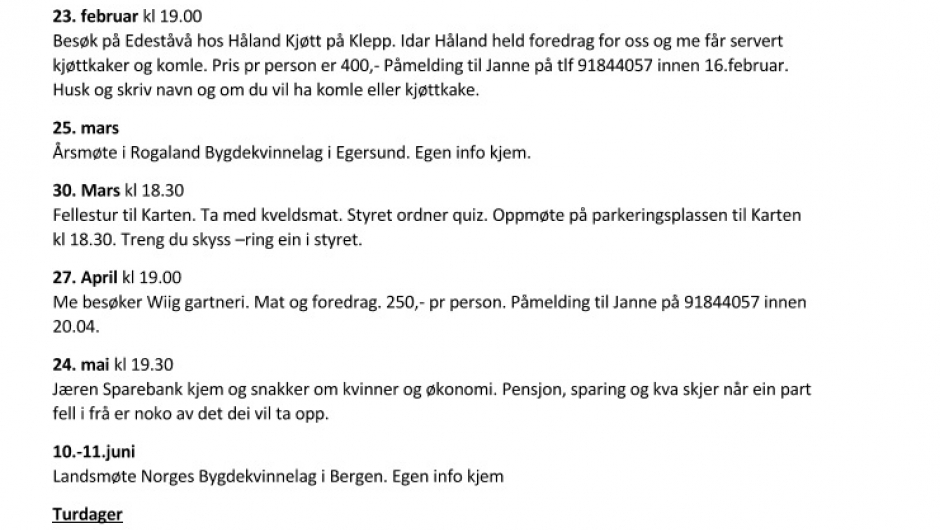 Besøk på Edeståvå hos Håland Kjøtt på Klepp. Idar Håland held foredrag for oss og me får servert kjøttkaker og komle. Pris pr person er 400,- Påmelding til Janne på tlf 91844057 innen 16.februar. Husk og skriv navn og om du vil ha komle eller kjøttkake.