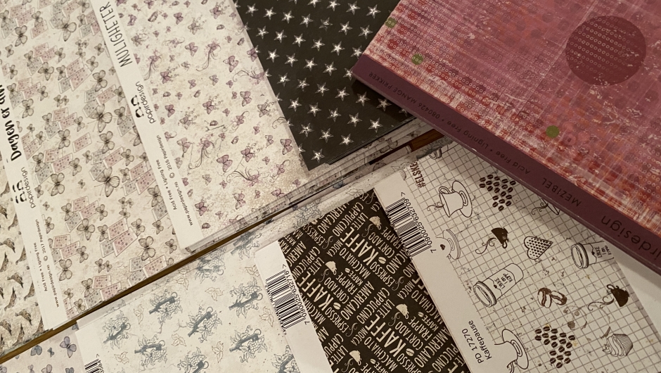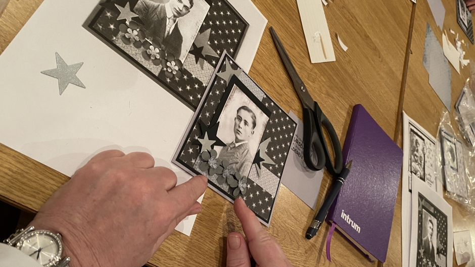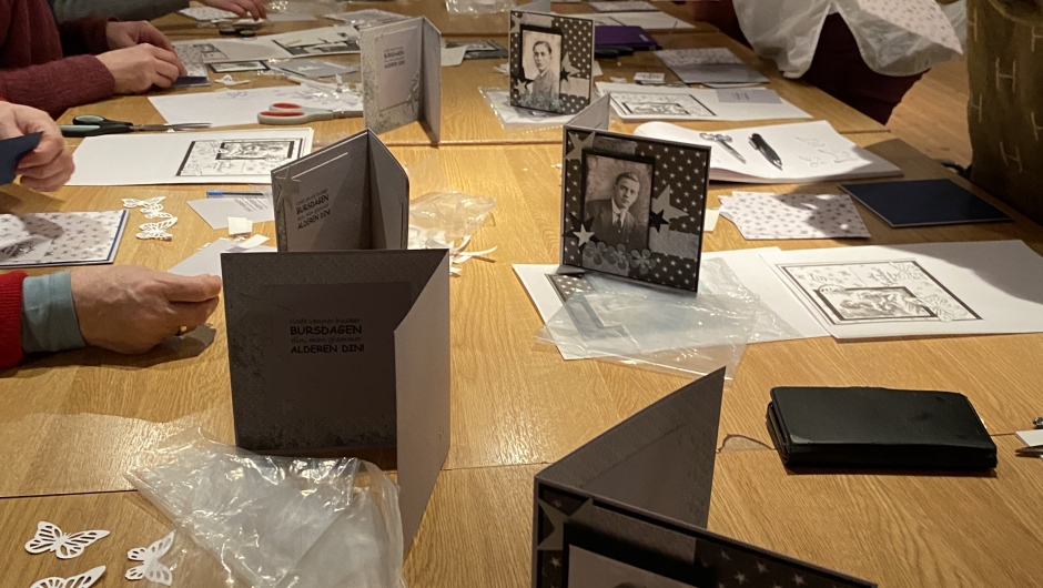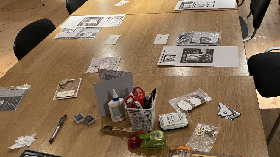 Vi kom til ferdig dekket bord, hvor deler til to kort var kuttet og samlet i hver sin pose for alle deltagerne. Etter en informativ innledning av Anne Lise Sjøberg og Grete Stærkebye, med gode tips, triks og råd om hvordan lage egne papirkort, satte vi alle i gang. Med gode instruktører, tunga rett i munnen, godt øyemål, stødige fingre og livlige samtaler og kommentarer, fikk vi alle sammen laget to kort hver. Noen av oss merket at vi hadde litt store fingre når blomster skulle monteres, sommerfugler farves og småstjernene limes, men vi hadde det alle sammen gøy. Mange benyttet anledningen til å kjøpe med litt papir for å fortsette hjemme. Vi setter nok ennå mer pris på håndlagede kort nå som vi vet hvilket arbeid det innebærer.