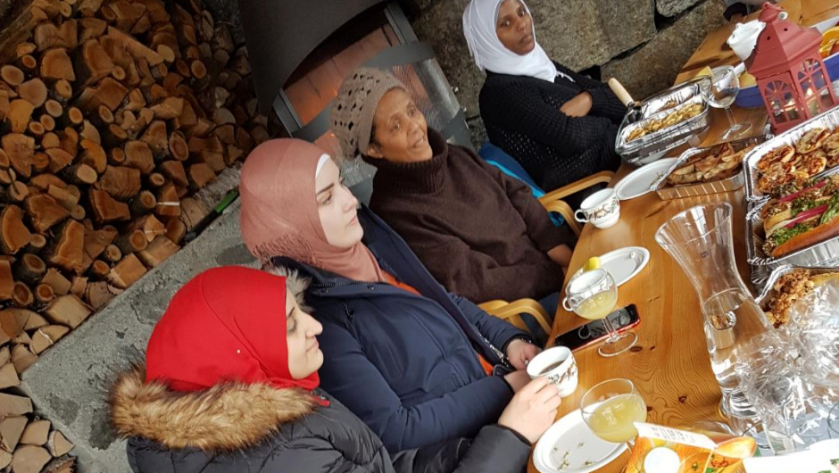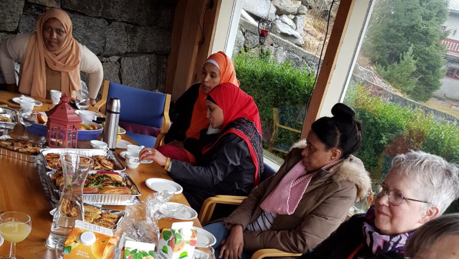 Rasha hadde laga fleire typar "fingermat" av typen "pizzasnurrar", med innslag av syrisk mat. Heilt nydeleg smaka det. Det vart og servert frukt og drikke. Vi prata om forskjellig, og kvinnene prata seg imellom. Ei av kvinnene merka seg at Liv Solfrid hadde eit spisebord på kjøkenet og eit i stova. Kunne det vera nødvendig? Med det kom vi inn på skikkane i Norge der vi et kvardagsmåltida på kjøkenet, men når vi har gjester, eller det er jul og feiringar vert det dekka på i stova.
