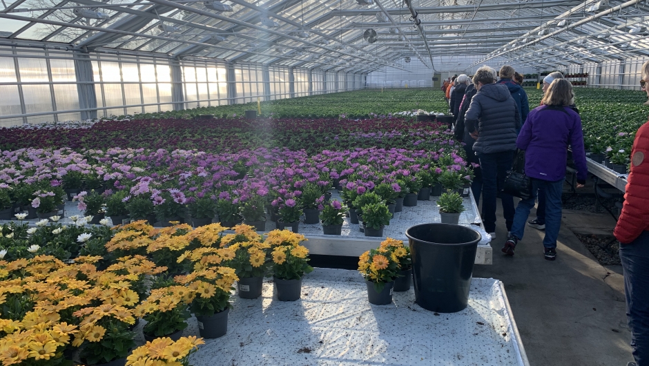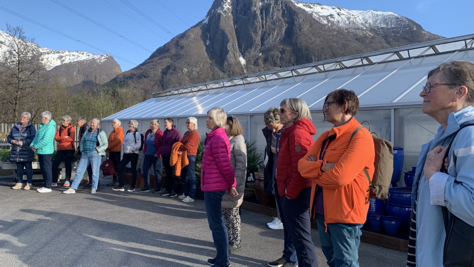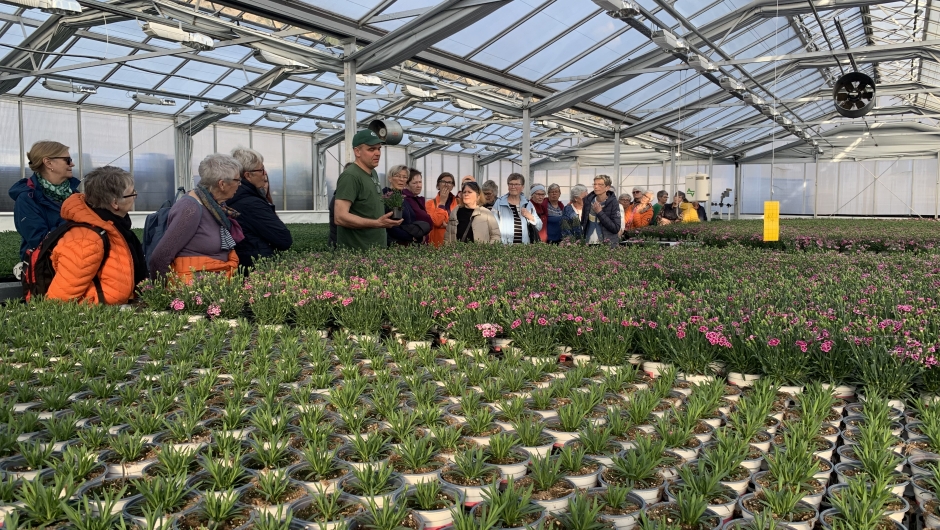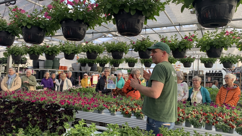 Rundt 50 damer møtte opp i Fredheim Gartneri i kveld. Her fekk vi omvisning av eigar og dagleg leiar Terje Hus. Besteforeldra hans starta drifta av hagesenteret og det fyrste drivhuset stod klart i 1947.