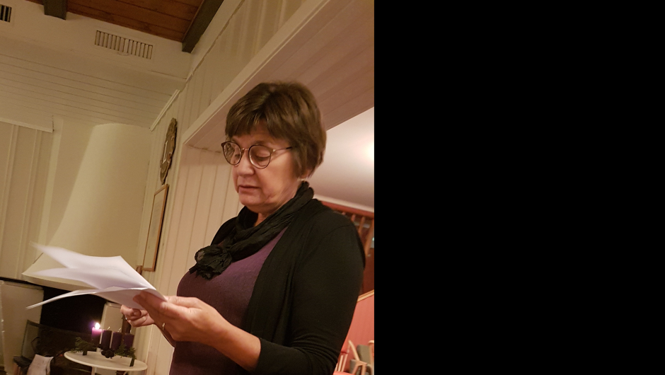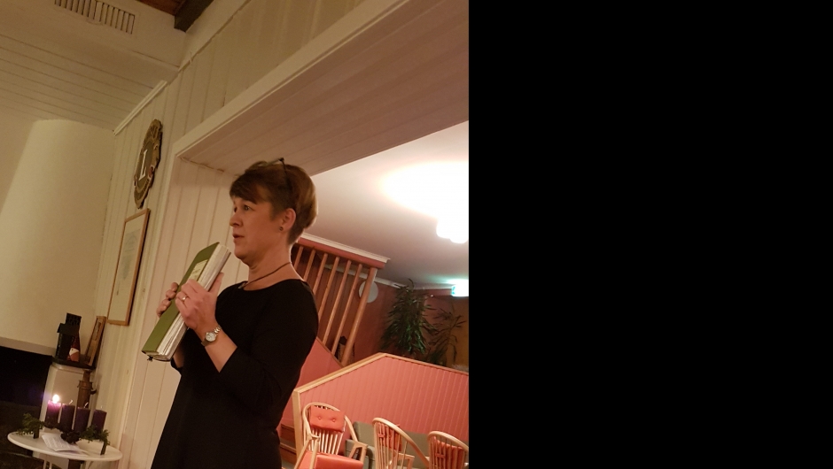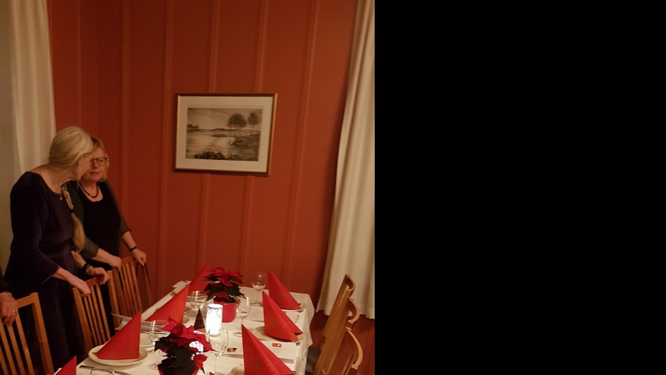 Vi ble ønsket velkommen og Anbjørg tente lys. Vi fortsatte inn til et julepyntet festbord. Den "røde stua" på Tingvang har blitt litt mindre rød og har fått nye flotte møbler. Det ble riktig så fint der.