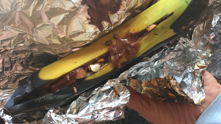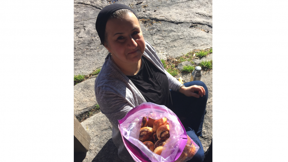 Khawla hadde med nydelige småkaker, noen fylt med pistasjenøtter, og noen med daddel. Vi hadde med bananer som vi fylte med hakkede mandler og sjokoladebiter, de ble pakket inn i aluminiumsfolie og lagt på bålet. Kalkungrillpølser surret vi med pinnebrøddeig og stekte på pinne over bålet.