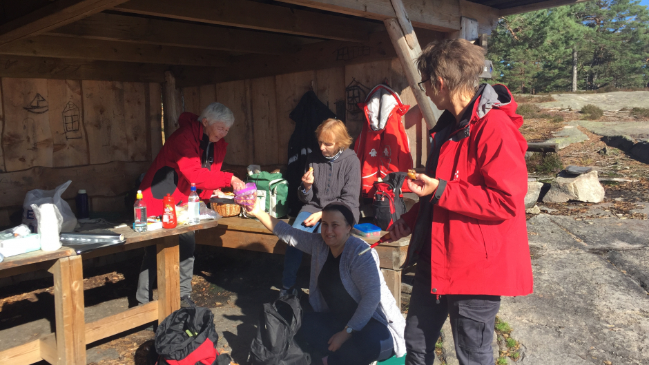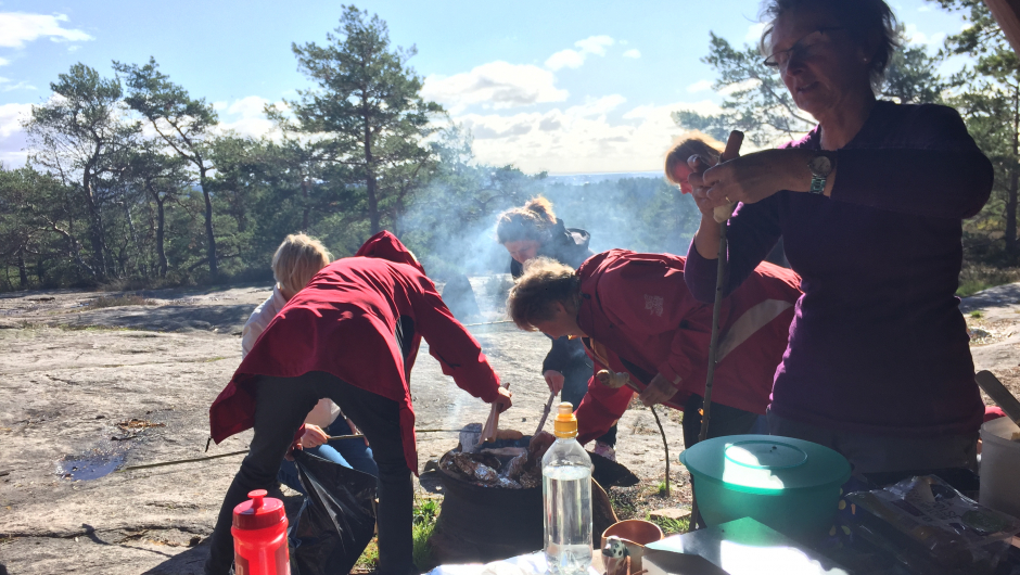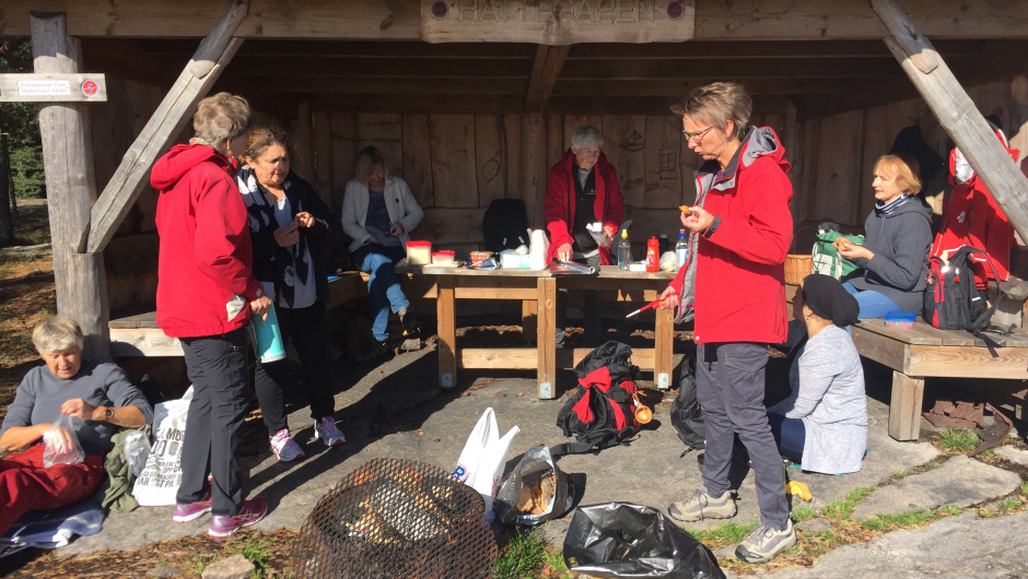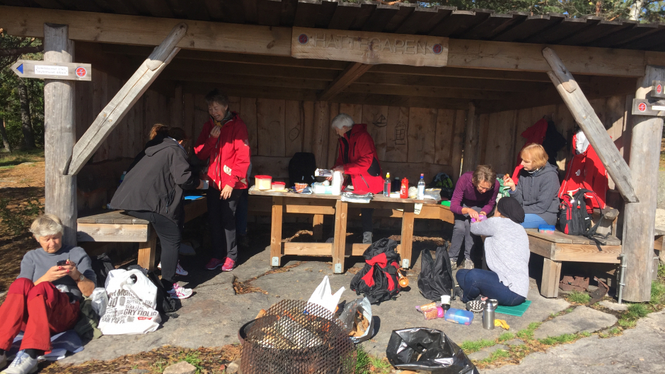 Lørdag 22.9.18, hadde vi en hyggelig tur i Rolvsøymarka. Det var flott høstvær, og vi var ni stk på tur til Hattefjellet og Hattegapen. På vei opp fant vi litt sopp, granmatriske og noe skrubb. Vi var sultne da vi kom fram, og bålet ble tent med en gang.