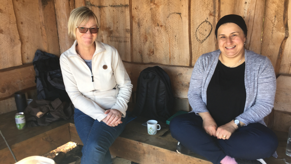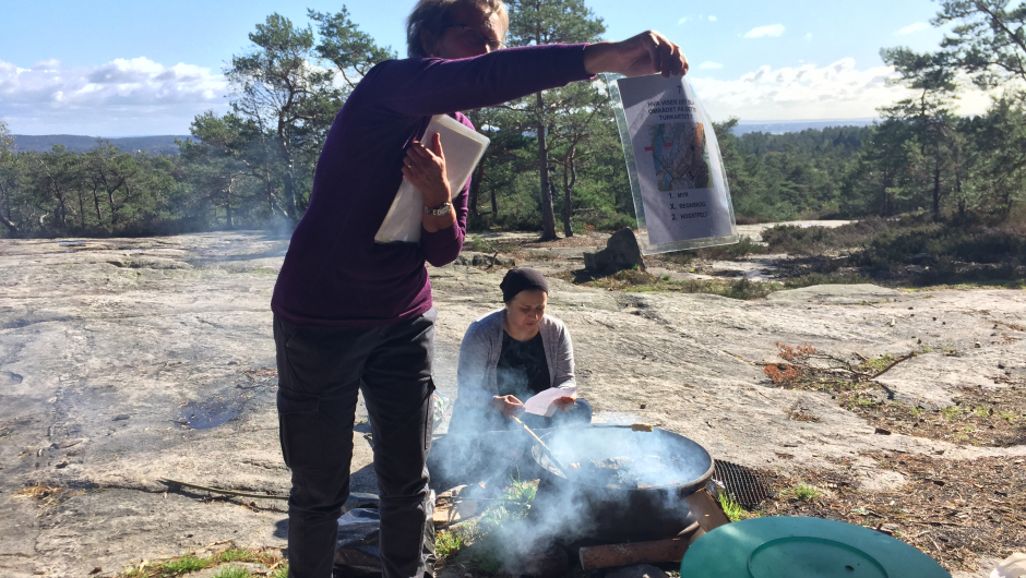 Vi hadde også en søt pinnebrøddeig, og Karin hadde laget til "Brimimat", lomper med fyll som ble varmet i folie på bålet. Karin hadde laget til en naturquiz, og våre nye turvenner, Gullala, Virginija og Khawla fikk en drikkekopp og en grillpinne i premie for deltagelsen.