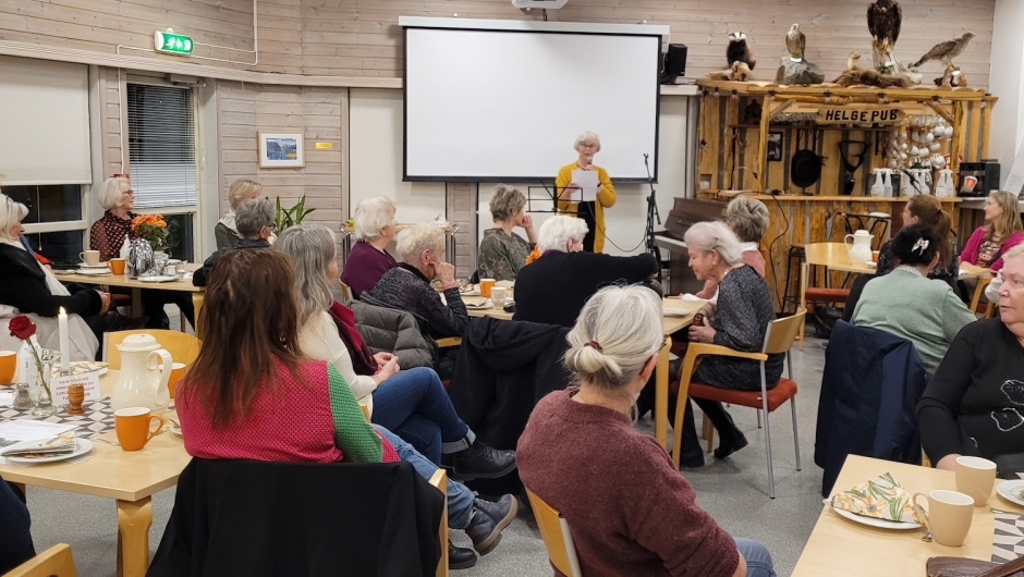 Så var det tid for kveldens hovedgjest. Vibeke Vigeland er danser og forfatter av boken "MODEN - kunsten å bære alderen med visdom". Hun proklamerte at den sterkeste kvinnen er "overgangskvinnen" og oppfordet oss til å bruke kvinneligheten vår, myke opp føttene - det er der all bevegelse starter, og å fokusere på å stø støtt på beina, bokstavelig talt. Hun siterte også filosofen Simone De Beauvoir: "Hvis du samtykker til å bli eldre, blir du et helere menneske". Kanskje noe å reflektere over for mange av oss.