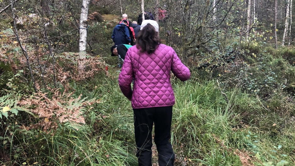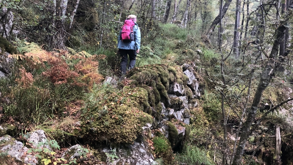 At løypa innimellom høge, mørke grantre skulle vera lett, er ei overdriving. Det gjekk jamt bratt oppover, og me måtte sjå oss godt for i det lange graset så me ikkje snofla i steinar eller røter som låg rett over vegen! Det blei lang, lang rekke etter kjentkvinne Kathrine Berge Seland. Og tung pust for nokre av oss... Litt blåbær kunne me kosa oss med medan me tok ein pust i bakken, for lite visste me at det vart kaffi og kaker på toppen.