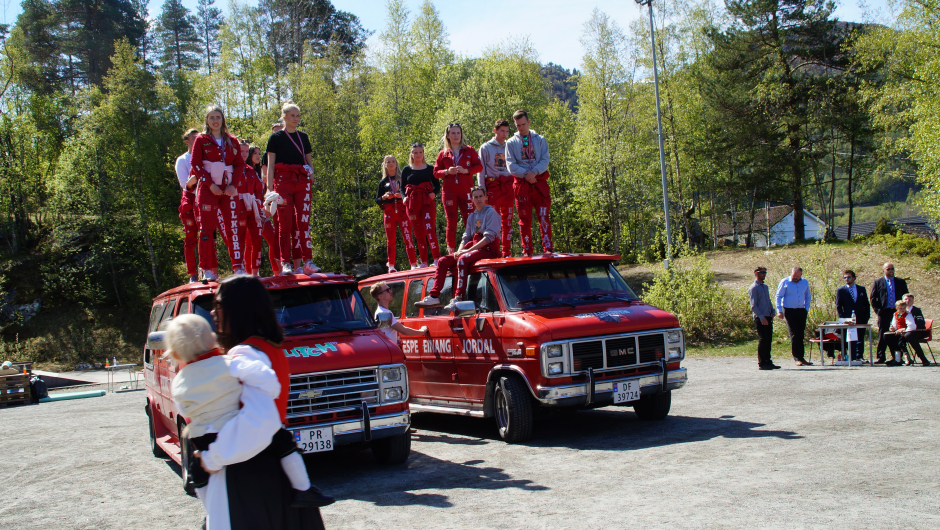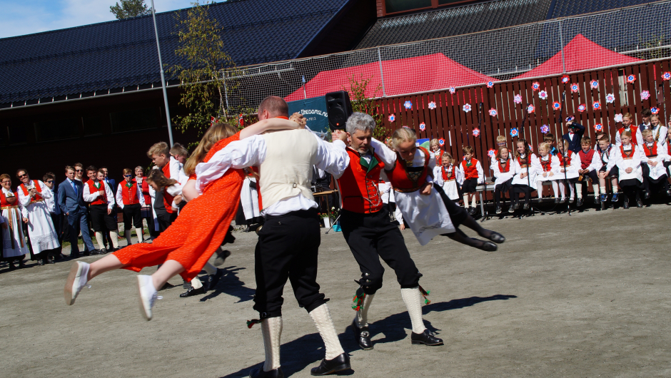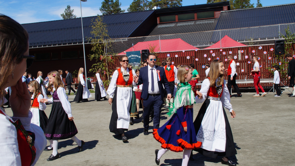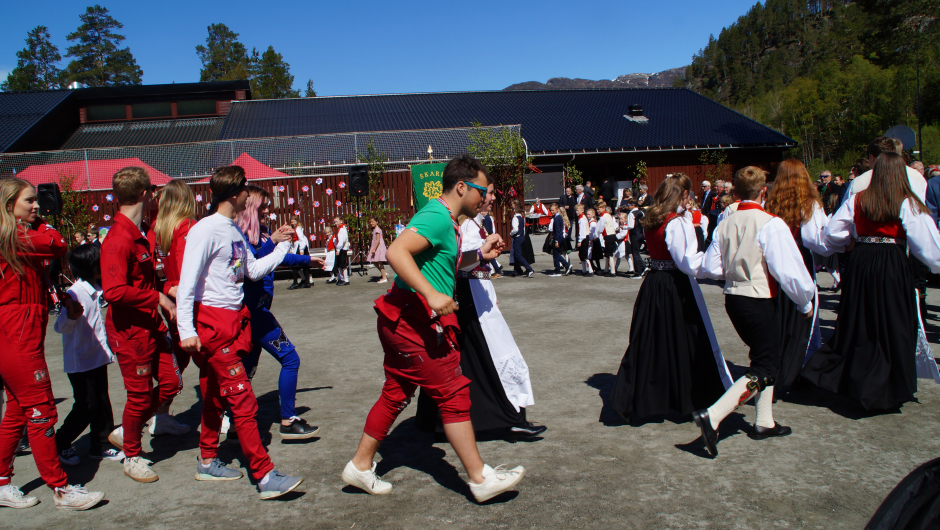 Det er 7.klasse (avgangsklassen) sammen med foreldre, besteforeldre, som kvart år lager i stand til den store dagen. Dei ønska oss velkomen og fortalte om tida si her på Skare Skule.