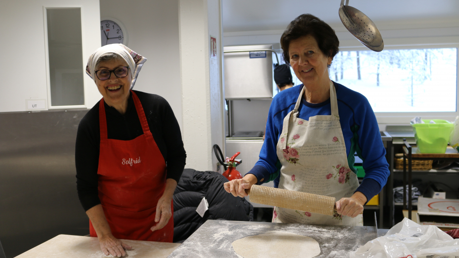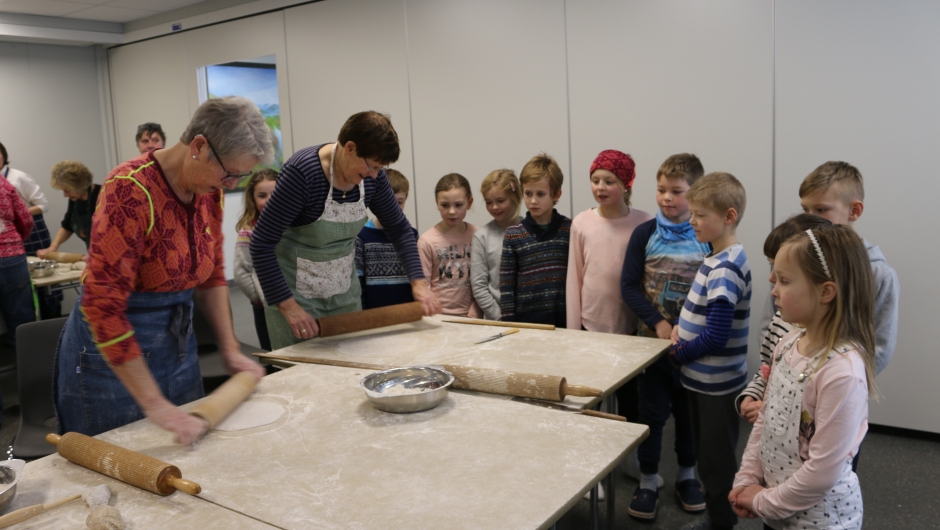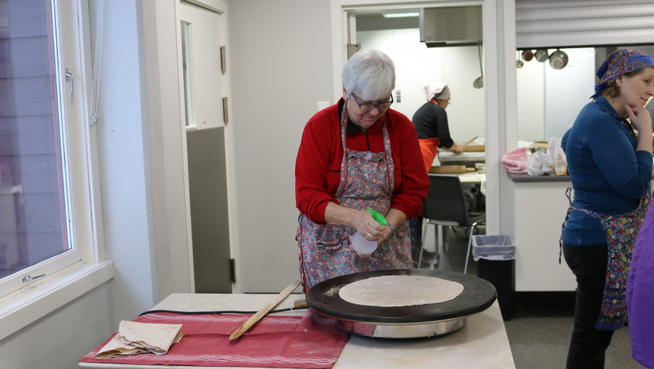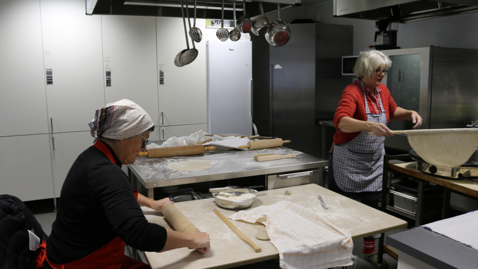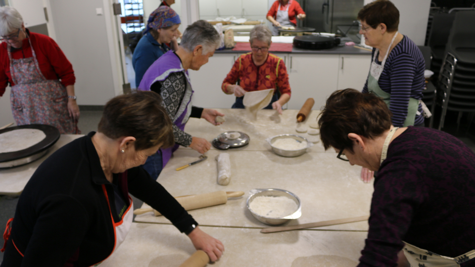 Dagen etter møtte alle opp klokka 10.00. Vi delte oss i 3 grupper - 5 i kvar og hadde med ein "ekspert" i kvar gruppe. Fire takker var i bruk, mange kjevler og tilhøyrande utstyr Vi delte på oppgåvene  slik at alle i ei gruppe fekk prøve seg på å laga emner, å kjevle og å steike.