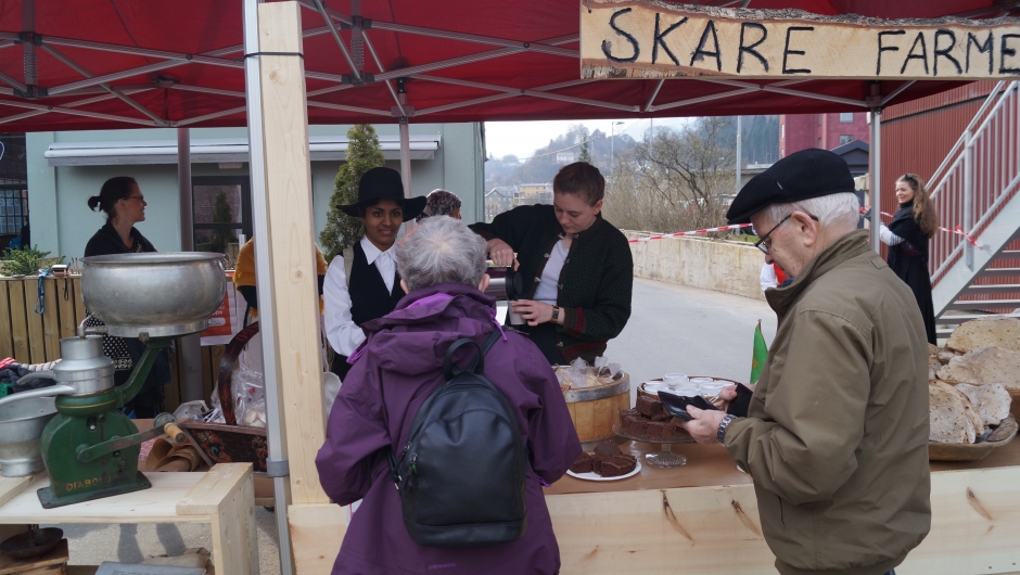 Lørdag 6.april var me ein gjeng frå bygdekvinnelaget som hjalp 4H arane som hadde laga til "Skarefarmen" i Odda. Det var grunna teaterstykke som skulle visas samme kveld om Albert og Leonie. Alle i Odda blei bede om å kle seg ut i gamle klede og ein del hadde gjort det.