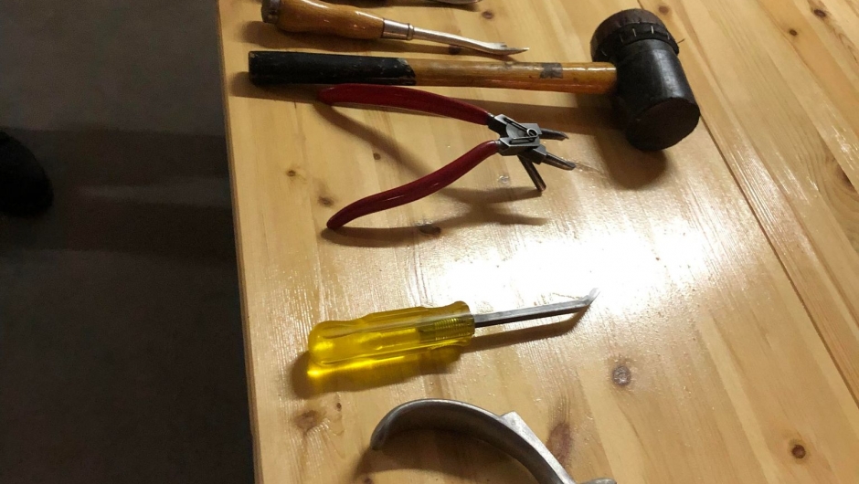 Tang, kniv, stiftmaskin/krampepistol, saks, hammer, nål og tråd og symaskin. Instruktøren vår, Trond Thomsen, har hatt med en del utstyr, stoffer og forbruksartikler som kursdeltagerne fikk låne eller kjøpe av ham.