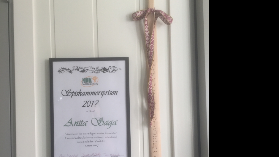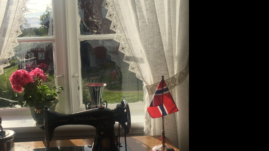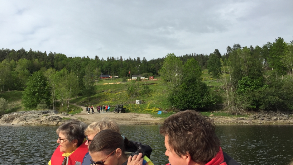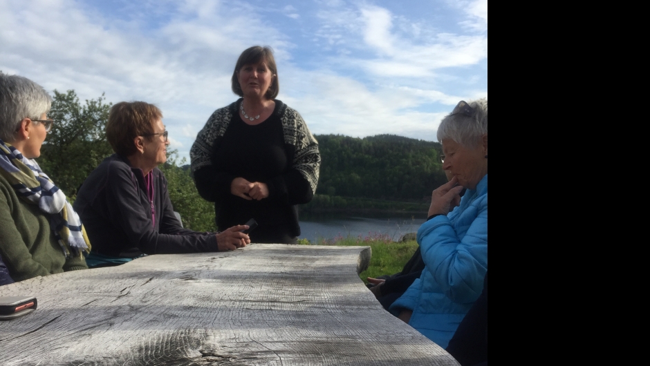 Vi fikk en fin omvisning i alle byggene på gården, pusset opp i tidsriktig stil, nostalgisk og vakkert. Så var det servering av spekemat, flatbrød, eggerøre, potetsalat og andre herligheter. Etter mye prat, kaffe og lefser, overrakk Mette blomster til vertinnen som takk for at vi fikk komme på besøk. Så ble vi kjørt i land og kvelden var over.