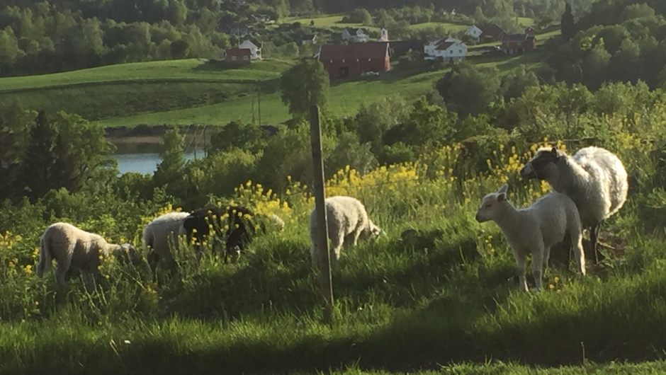 Gården ligger på Bjørnøya som ligger midt i Farrisvannet. Vi ble hentet på brygga av Anita og fraktet ut på øya i båt. Der var det naturskjønne omgivelser som møtte oss. Det var sauer på sommerbeite, blomster og vakker natur, koselige gårdsbygninger og ikke minst en veldig hyggelig vertinne, som fortalte oss litt om Bjørnøyas og gårdens historie.