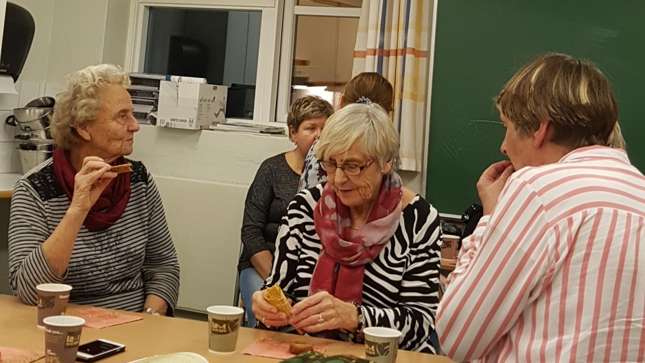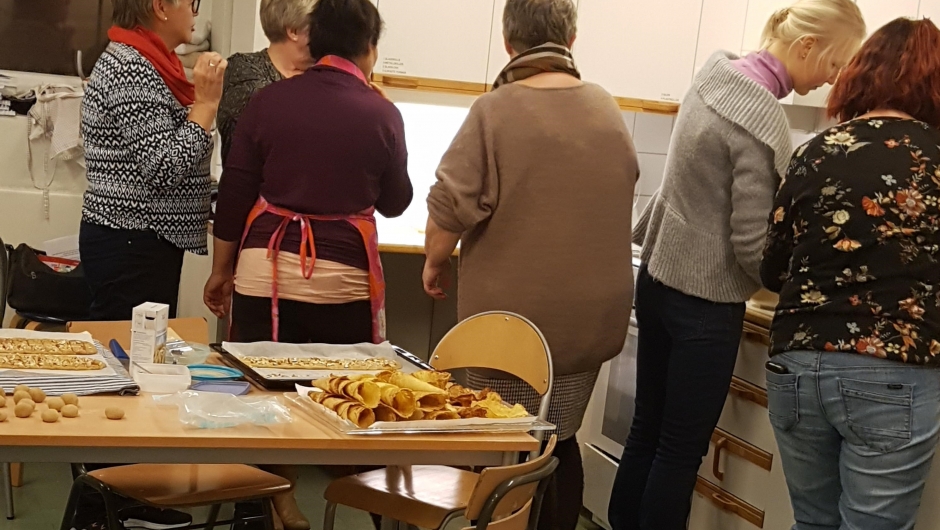 Her kom Oddveig, 87 år med smultgryte og smultring røre.  Og opp fra smultgryta kom de deiligste smultringer.  Kirsten hadde med eldgamle sandkakeformer og bakte pene og gode sandkaker.  Jeg så Lisbeth og Mette ved krumkakejernet.  Her og ble det en stor «haug» med kaker.