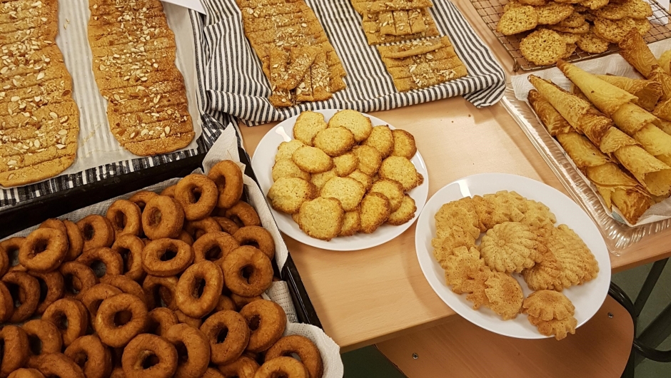 Det ble bakt havreflarn, serinakaker, peppernøtter, brune pinner og kokosmakroner.  Ivrige damer bakte, stekte og mange flere bivånet det hele og alle smakte.  Nystekte kaker er best!