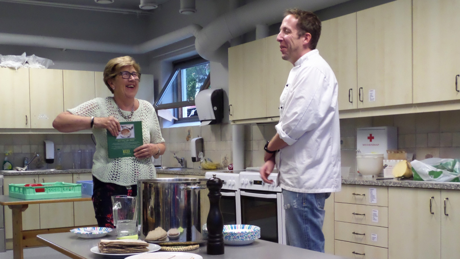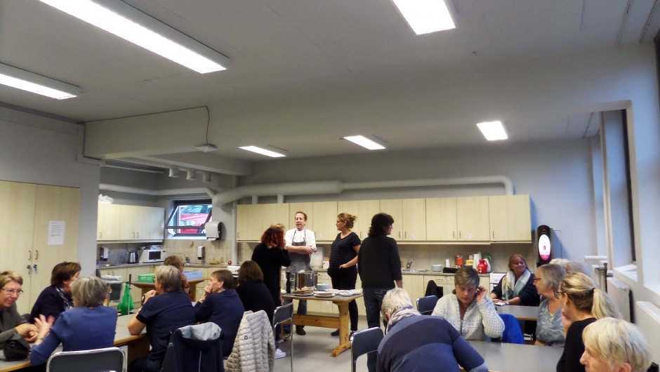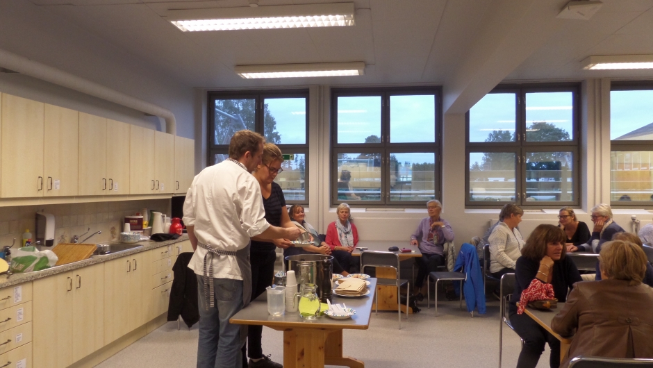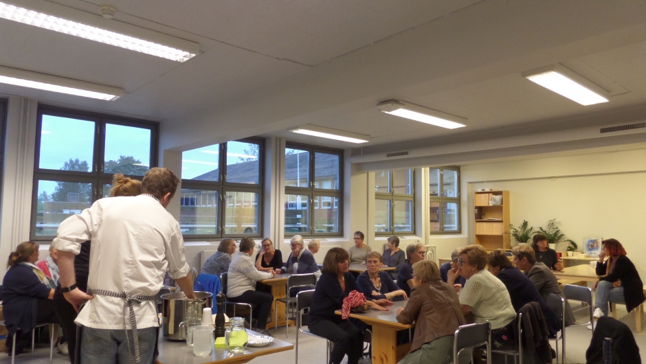 Ullensaker Bygdekvinnelag på Mogreina skole 29. september 2018. Tema; tradisjonsmat.  Trond Smedstuen, til daglig kokk på Nes sykehjem, viste oss sin versjon av høstsuppe.  Han er veldig glad i å bruke lettsalta svineknoke og vanlige norske grønnsaker, kålrot, gulrot, potet og purre.  Svineknoken var kokt på forhånd, grønnsakene ble kuttet i terninger og kokt i krafta.  Et lite pepperdryss og så var suppa klar.  22 damer koste seg med den gode suppa og flatbrød til.