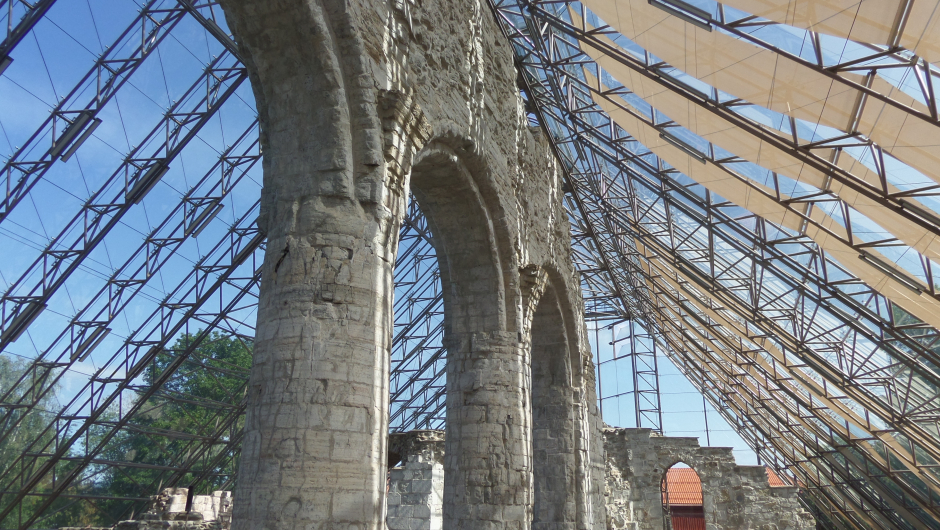 Vi fikk omvisning i ruinene av syngende guide.  Først fortalte guiden om domkirkeruinene med glassvernebygg og folkemuseum. Inne i glassbygget fikk vi høre gregoriansk sang.