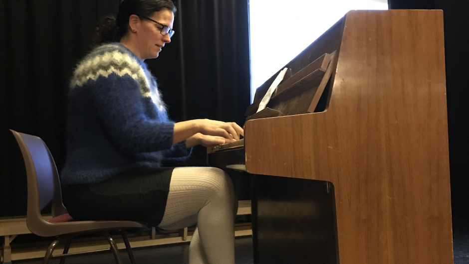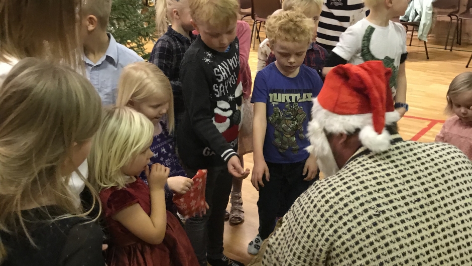 Så var det gang rundt juletreet. Ann Karin spilte til og noen kjente sanger ble sunget. Vi avsluttet med «På låven sitter nissen». Og da var plutselig nissen der med godteposer til barna.