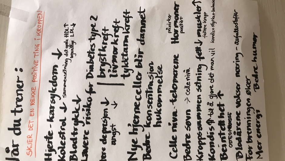 150 min med moderat intensitet (kan snakke) pr uke er et mål. Høy intensitet (korte svar) - da holder det med halve tida. En kombinasjon er nok best, og å gå tur i terreng er kjempebra. Og ta litt styrke og balanse foran TV'n etterpå!