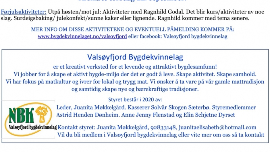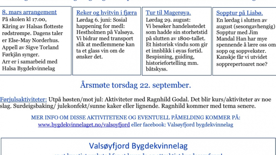 Valsøyfjord bygdekvinnealg har en del aktiviteter på programmet også for 2020. Her er en liten oversikt over det vi vet så langt at vi vil arrangere og delta på i 2020. Håper du finner noe du har lyst til å bli med på.