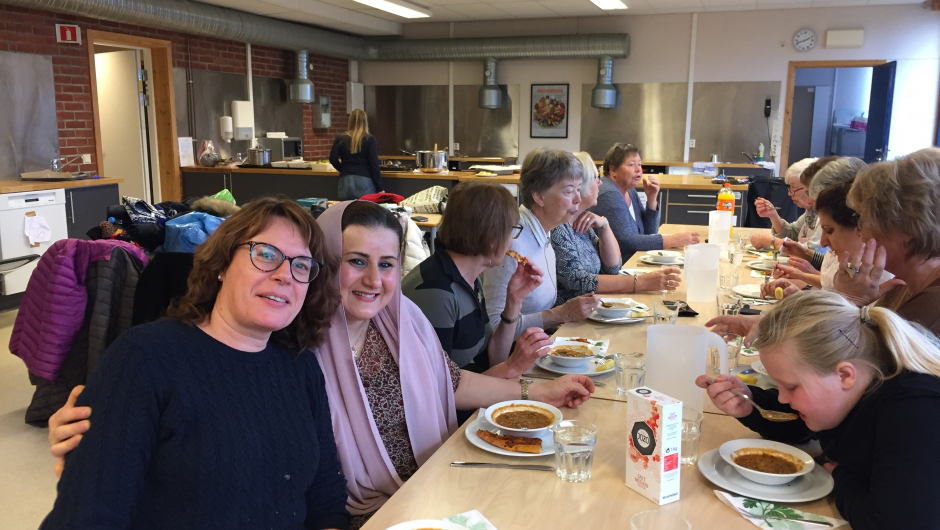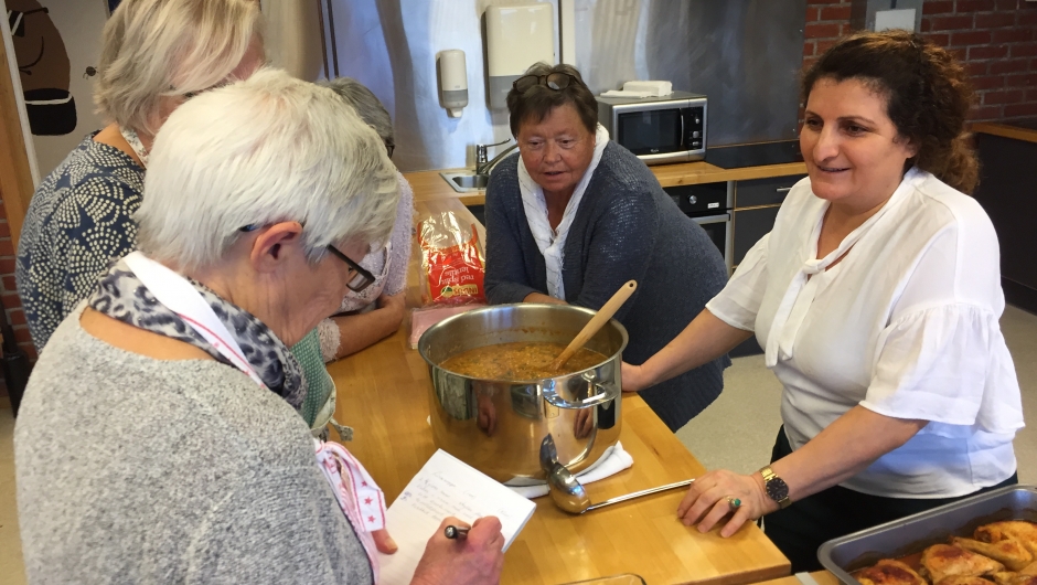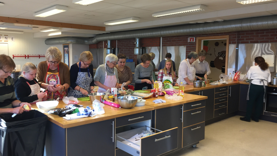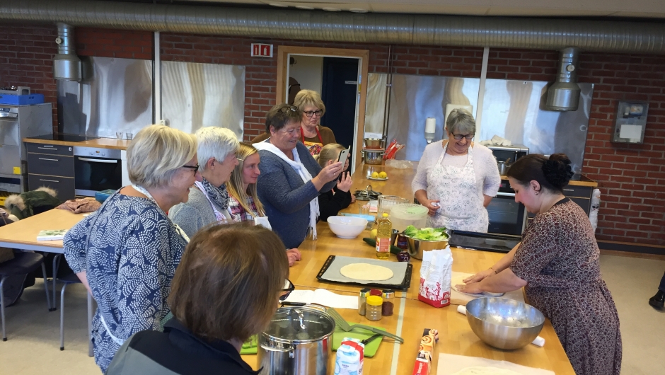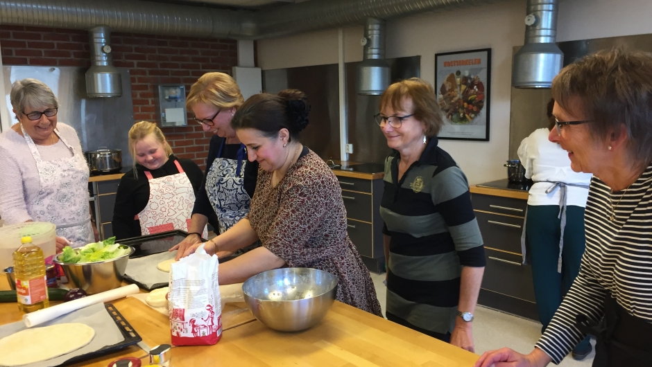 Lørdag 3. november hadde vi en utrolig hyggelig og lærerik dag på Haugeåsen ungdomsskole. Vi fikk låne skolekjøkkenet der, og Gullala og Khawla lærte oss å lage mat fra Irak. Adalat fra Syria, måtte desverre melde forfall. En fyldig linsesuppe med tomat, spinat og portulakk, -marinert kylling, ratatouille, korianderbrød og og en deilig salat stod på menyen. Etter noen timer med matlaging, den gode praten og det gode humøret stod i sentrum, kunne vi sette oss ned og nyte den gode maten. Tusen takk til Khawla og Gullala for at dere ville lære oss dette.