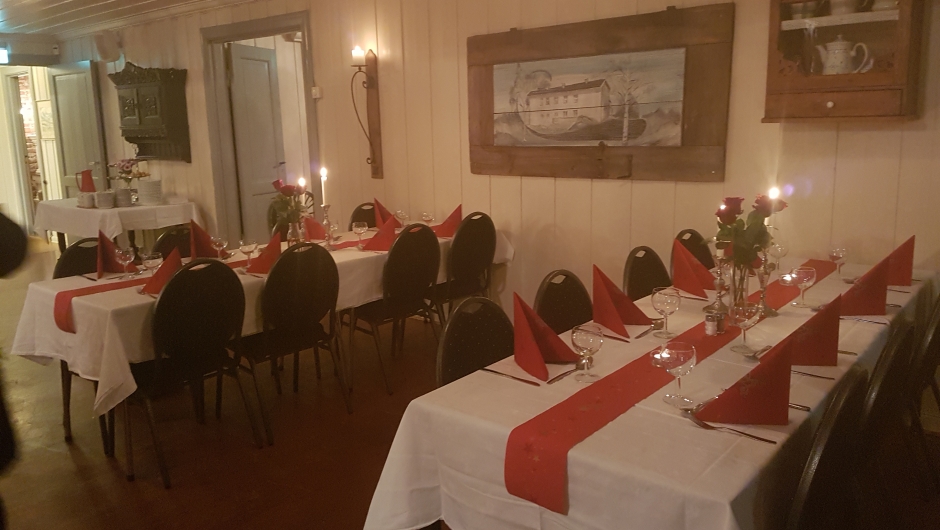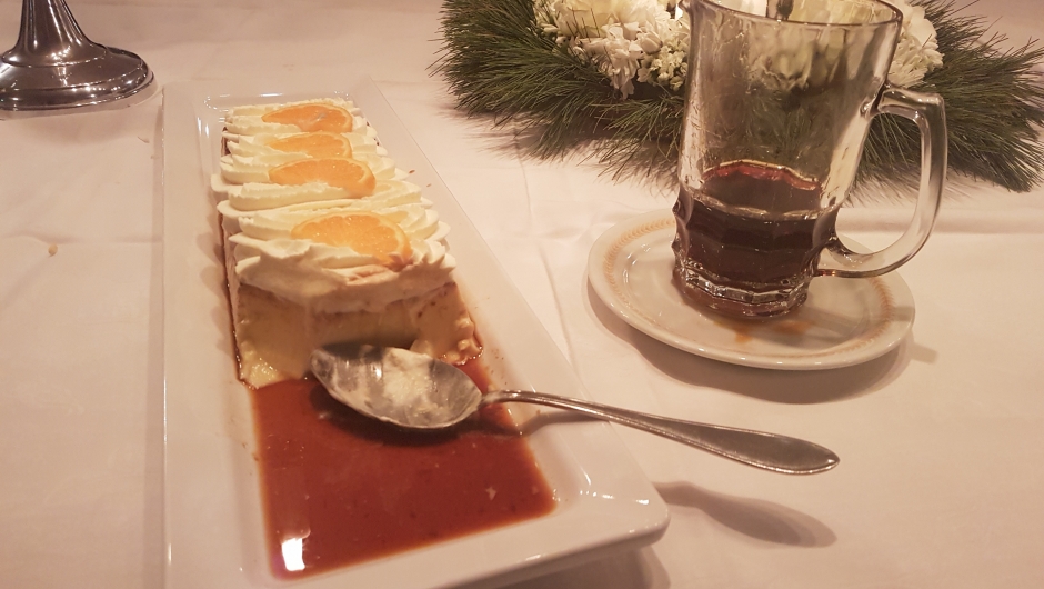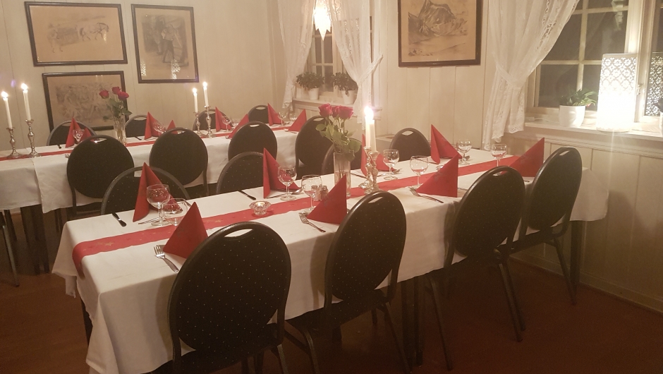 Menyen for kvelden var: Ribbe, medisterkaker, julepølse, surkål og annet tilbehør. Til dessert spiste vi karamellpudding med krem. Etter er herlig måltid sang vi Julekveldsvisa av Alf Prøysen.