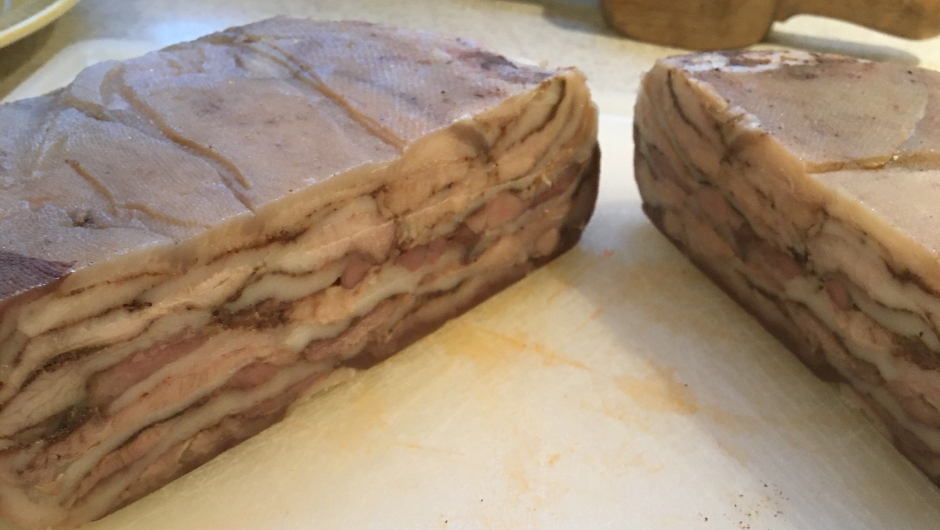 Lørdag var det tid for sylte. Lisbeth viste oss igjen, og det var mye å lære når man plukker fra hverandre et grisehode. Imens kokte hodene til kursdeltakerne, og da de var kokt ,skulle vi prøve oss på å plukke ut det beste fra hodet. Det var overraskende mye godt kjøtt. Å lage sylte er en helt annen fremgangsmåte enn rull. Grisehodet er kokende varmt og man bruker svor utenpå. Svoren må bare legges rundt uten å sy. Vi pakket sylta inn i klede og sydde kledet sammen. så ble den lagt i syltepresse etterpå. Det ble brukt både tradisjonelle presser i tre og mer moderne presser. Og hokus pokus, søndag var sylta klar til å bli spist, og smaken og krydringa var fortreffelig. Tusen rtakk til lisbeth som tålmodig og profesjonelt veildete oss gjennom dette kurset.