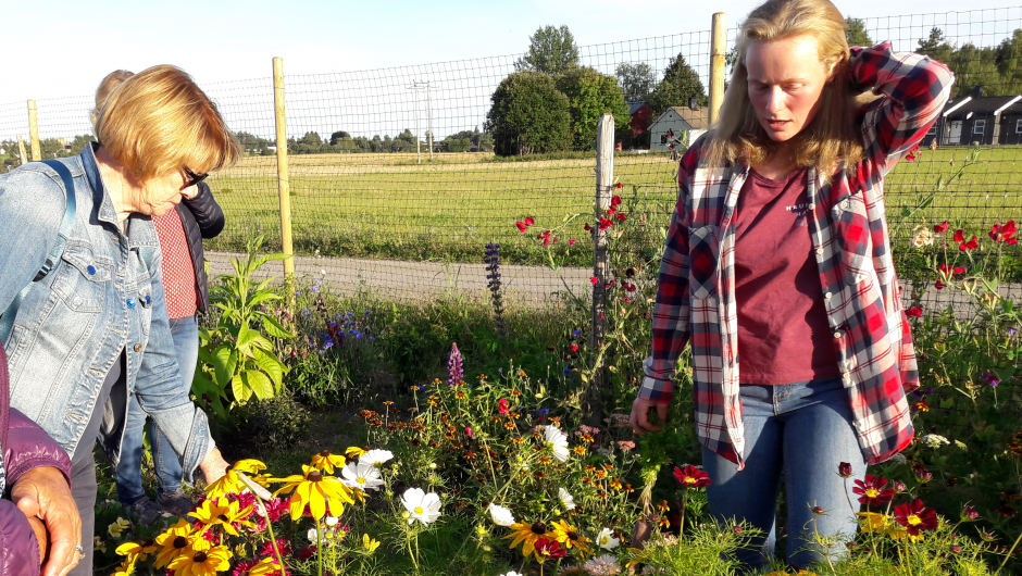 Vi fikk omvisning og informasjon i hagen. Begge gartnerne har faglig bakgrunn. Anne-Margit har gått på økologisk jordbruksskole, og Solveig har to år med gartnerskole. Da de ble kjent med hverandre ble de enig om å starte en markedshage sammen. Anne-Margits mor hadde for ca 10 år siden kjøpt bestefarens gård, og det ga muligheter for oppdyrking av en grønnsakhage. Planleggingen startet i vinter. Et jorde på 3 ½ mål ble pløyd opp, og de fikk diverse gjødsel fra bønder i bygda. Hagen er inndelt i soner. Det er dyrket grønnsaker på to mål. I kampen mot ugress lukes noe med hånd, og noen senger dekkes med plast. Gulrøttene står tett for å holde ugresset unna. Denne sommeren har de to gartnerne hatt uhell med beter på grunn av tørke etter såing. Mot insekter har de erfart at det er effektivt med insektnett.