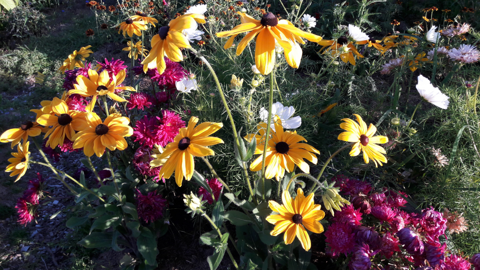Etter omvisningen fikk vi servering i låven, der det var pyntet med vakre blomsterbuketter. Både grønnsaksuppa og sjokoladekake med squash smakte veldig godt. Vi fikk også anledning til å kjøpe med oss grønnsaker. Vi hadde en hyggelig og interessant kveld, og vi er imponert over hva Anne-Margit og Solveig har fått til.