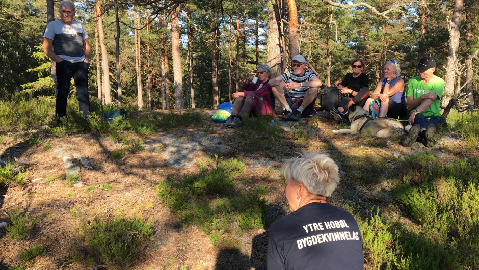 Rett på oversiden av hytta er det høyeste punktet på Hytteåsen, og der slo vi oss ned for å høre Tor-Erik fortelle. Plasseringen av hytta var nok ikke tilfeldig, hvis man klatrer opp i et tre her, kan man se mye av Østfold, andre siden av fjorden og til Holmenkollen.