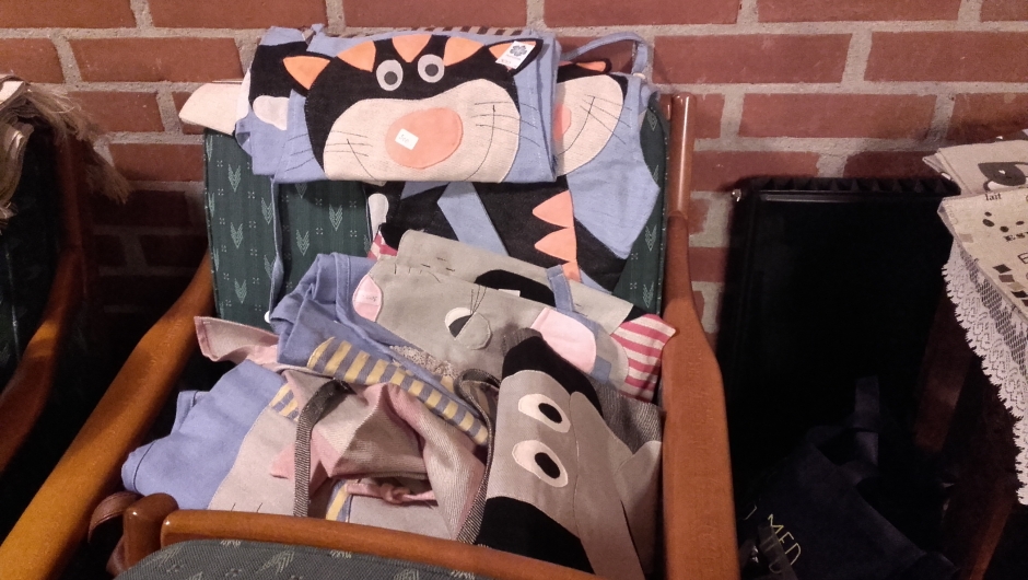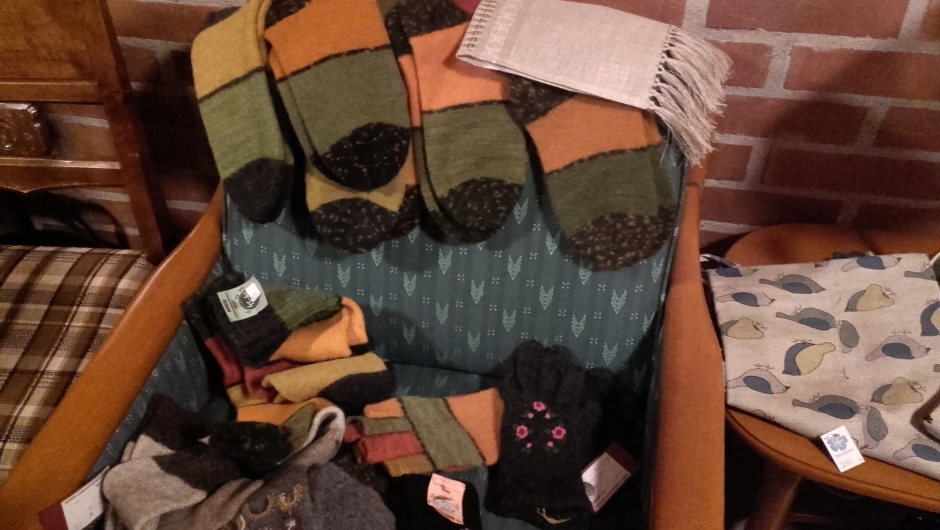 Hun hadde med strikkede sokker og vanter, sydde forklær og flotte vevde linløpere og duker fra damene i Litauen.